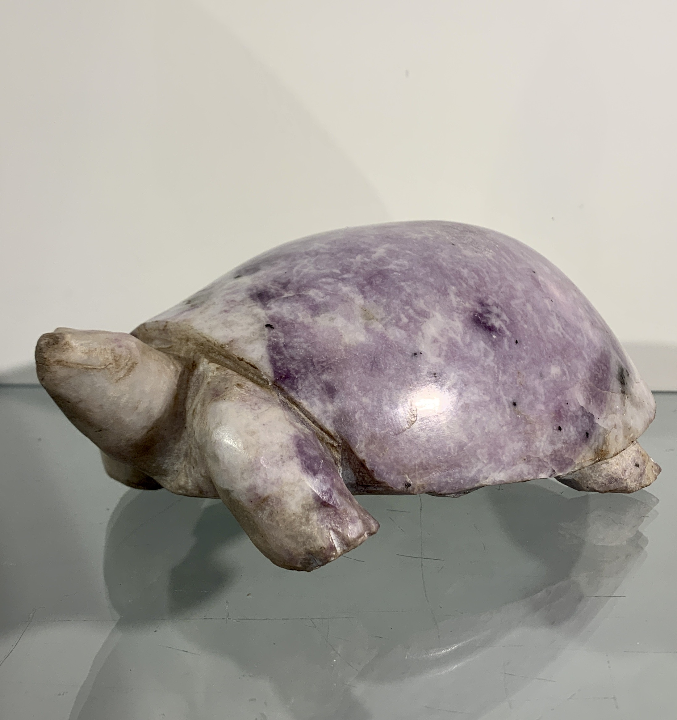 Schildpad gemaakt van het harde paarsachtige lapidolite door Mwanza uit Harare in Zimbabwe. Het beeld is 9 cm. hoog, 14 cm. breed en 22 cm. lang. Nr. 6233