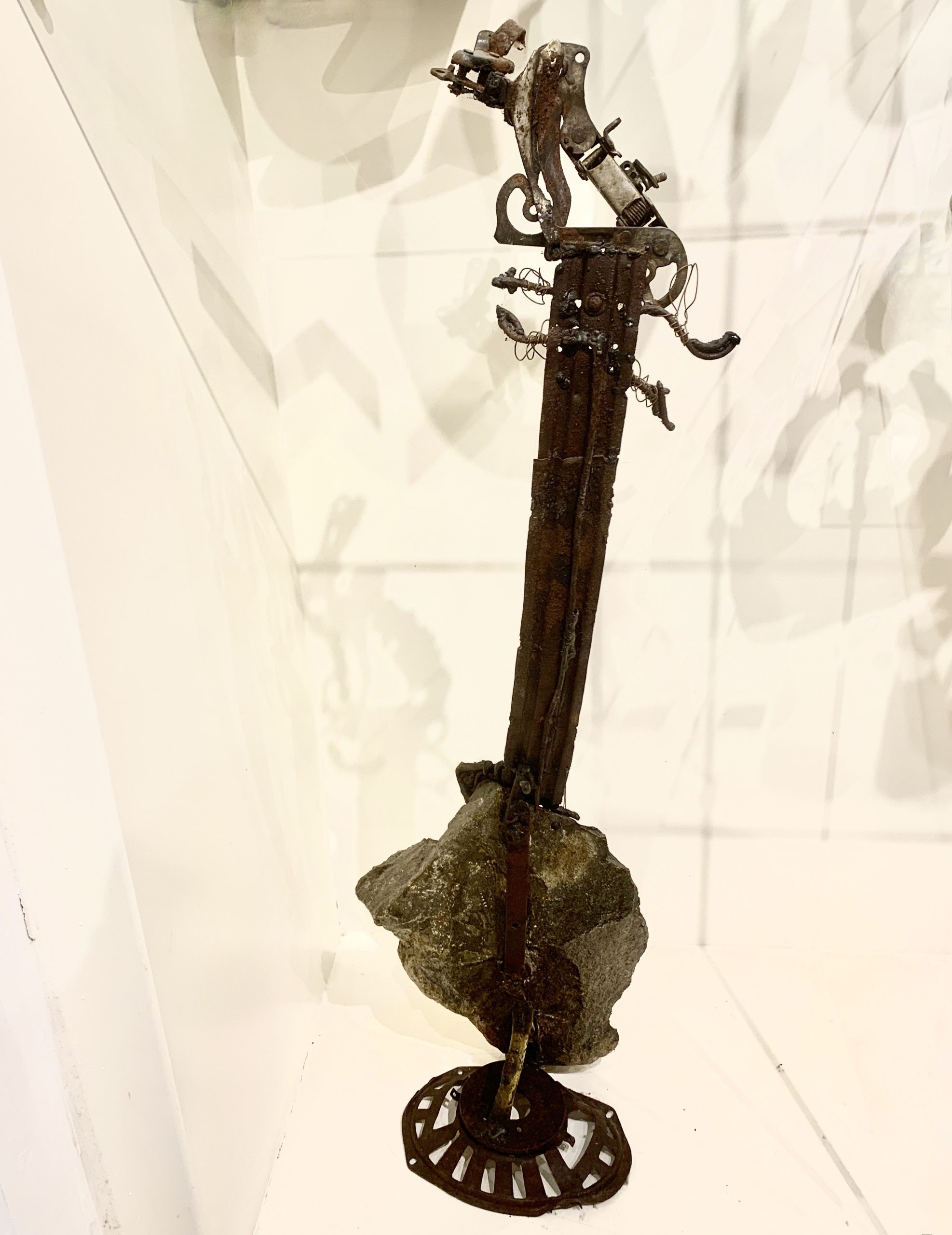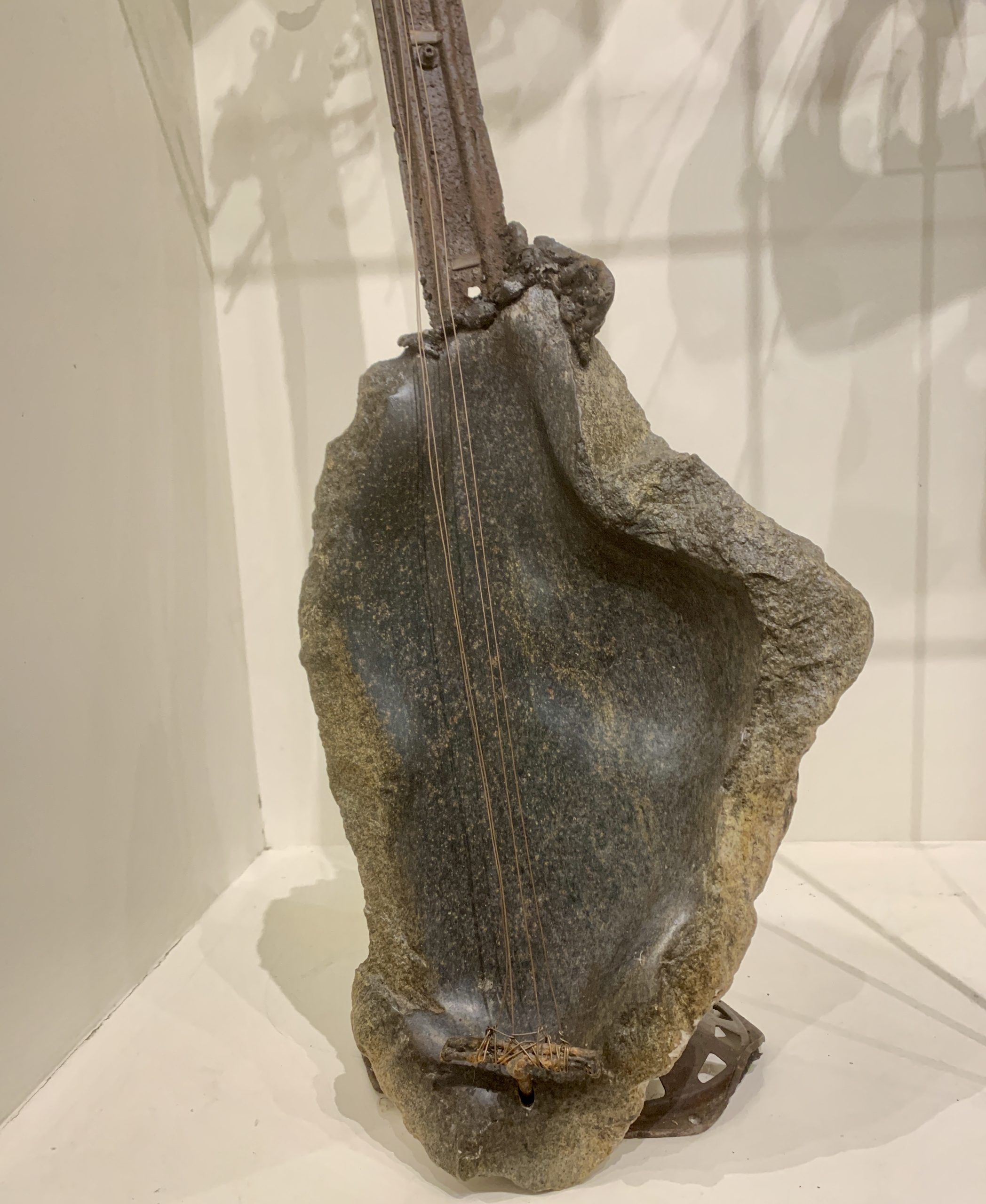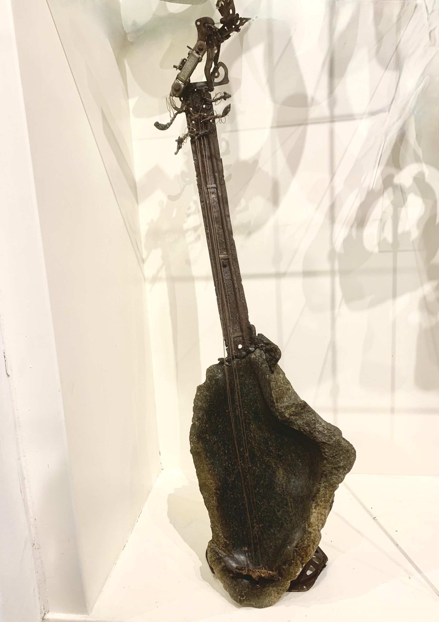 Stenen beeld ‘Gitaar’ uit serpentijn en Restmetaal | Handgemaakt uit Zimbabwe | 101 cm